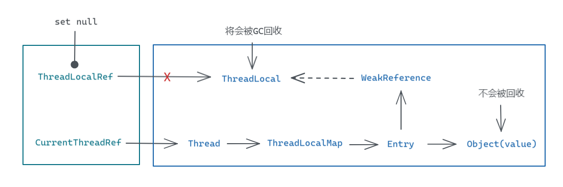 所以在 ThreadLocalMap 中可能存在 key 为 null 的 Entry,但由于这个 Entry 以及存储的 value 本身是一个强引用,因此不会被回收,这才发生了内存泄露。