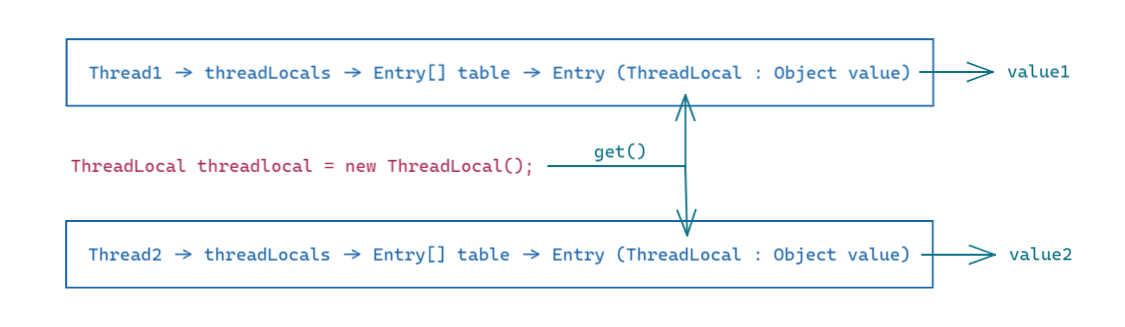我们使用 ThreadLocal 是通过 get() 方法来获取独享的值的,这个方法会先获取当前线程的 Thread 对象,再根据当前线程去获取一个 ThreadLocalMap,这是一个结构类似于 Java Map 的类,但它并没有实现 Map 接口。